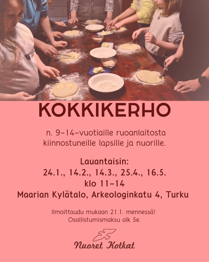 Kerho on suunnattu 4-7 lk ruoanlaitosta ja yhdessä tekemisestä kiinnostuneille. Valmistamme tavallisia kotiruokia, sekä toiveruokia. Opettelemme keittiökäyttäytymistä (mm. siivoamista, tiskaamista, yhdessä syömistä) kerhoajan puitteissa. Paikkoja on vain 10.